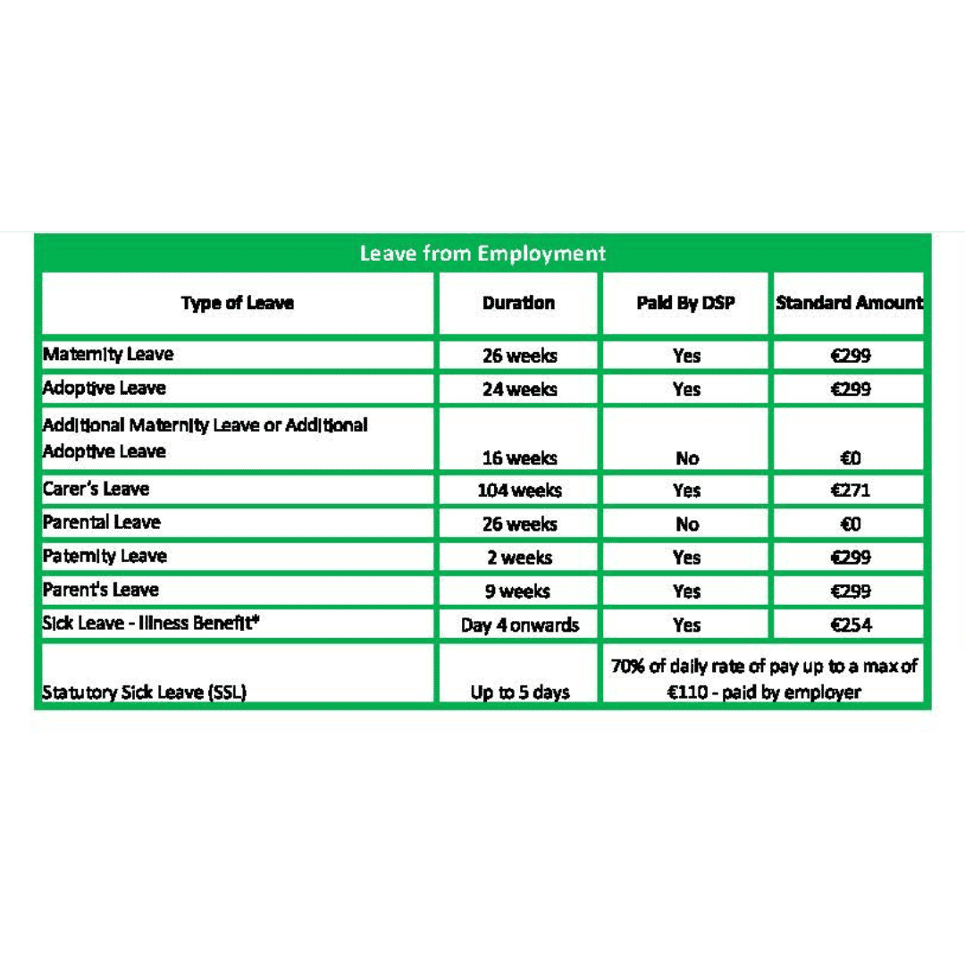 This table provides an overview of various types of employment leave, detailing their duration, whether they are paid by the Department of Social Protection (DSP), and the standard payment amounts. It serves as a helpful reference for understanding employee entitlements and employer obligations related to different leave categories.